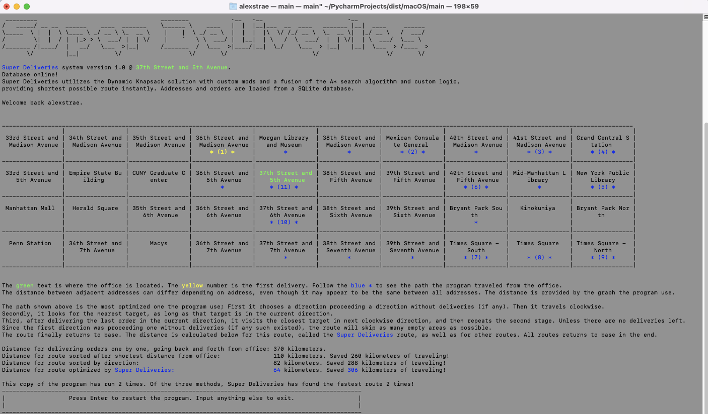 The goal of the program is to find the shortest possible delivery route for the highest valuable combination of orders. The program achieves this using the A* search algorithm, a dynamic knapsack solution and other logic. The user may: 1) Add, update or delete a custom order to the database and get all existing orders and 40 addresses from the database. 2) A unique, randomized delivery address is attached to each order. A graph is created from the addresses. 3) Optional: Choose a weight limit, as if you were delivering by bicycle for example, and get the most valuable combination of orders that meets the weight requirement. This is done through a dynamic implementation of the knapsack solution that allows you to get not only a total value, but the order(s) the value come from. POST orders to evaluate and receive the most valuable orders. 4) POST your orders and have the fastest route returned to you with its total distance, as well as the distance for other, simpler to calculate, delivery routes. Compare the distances; was the ‘Super Deliveries’ method the best?